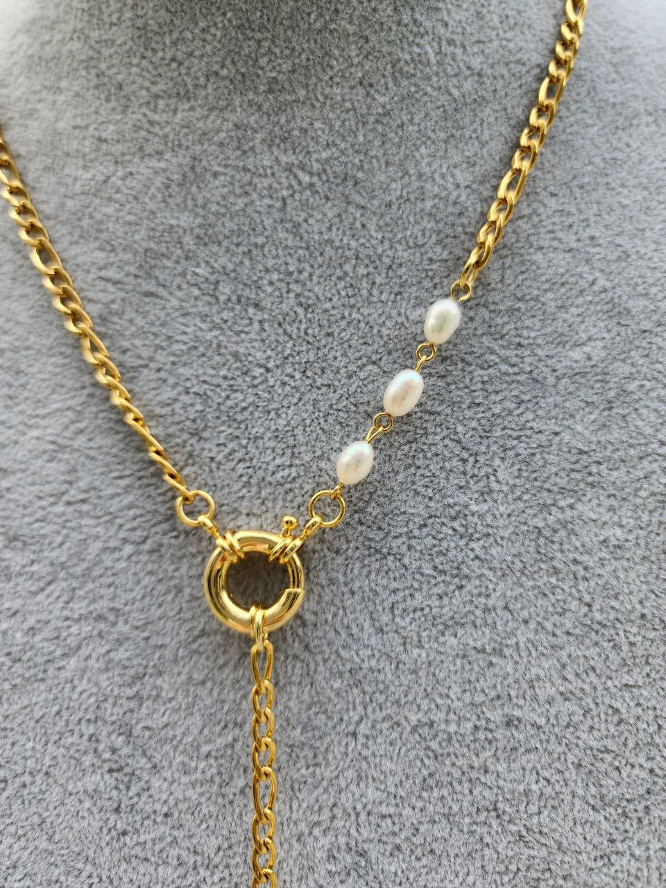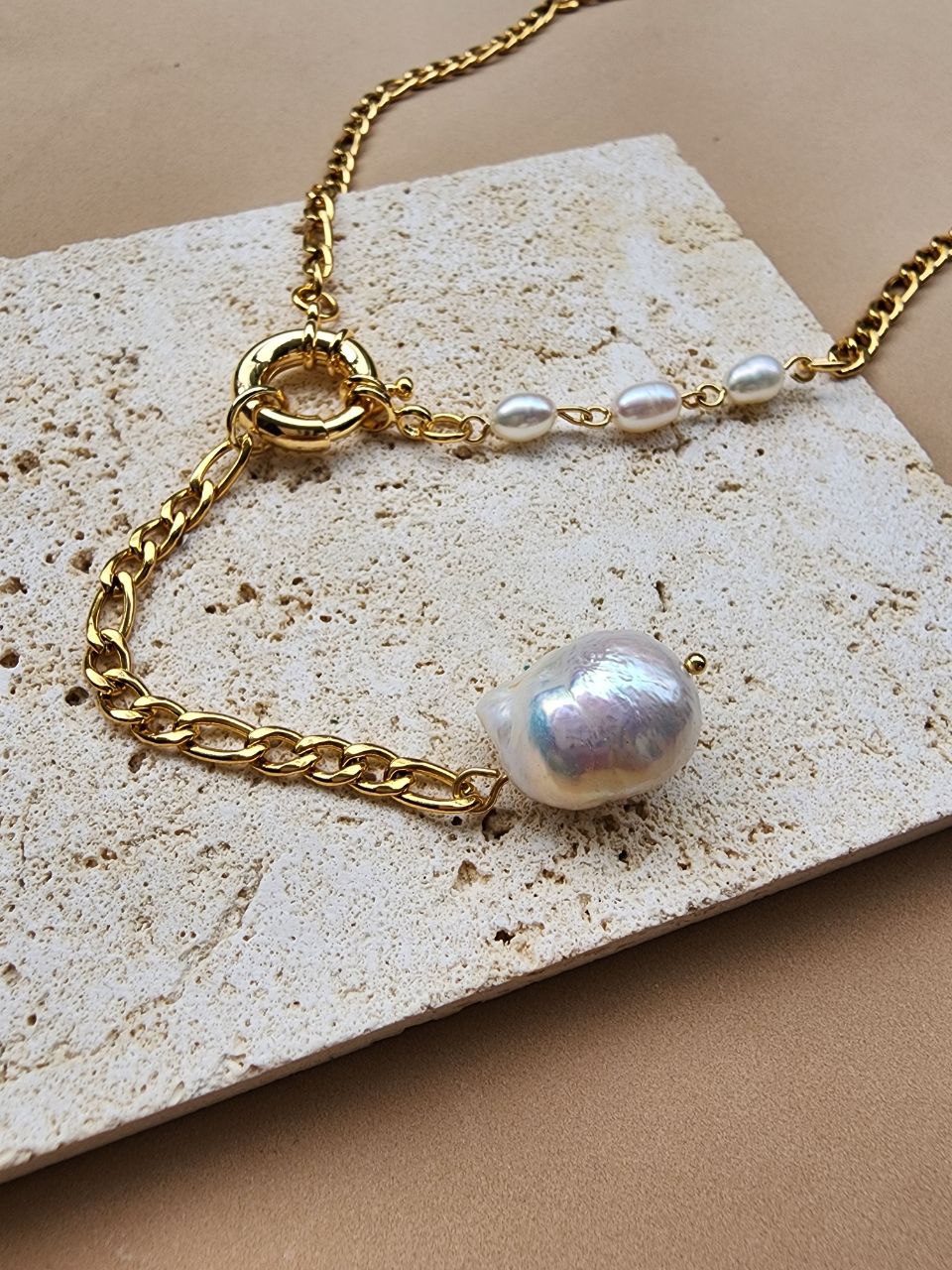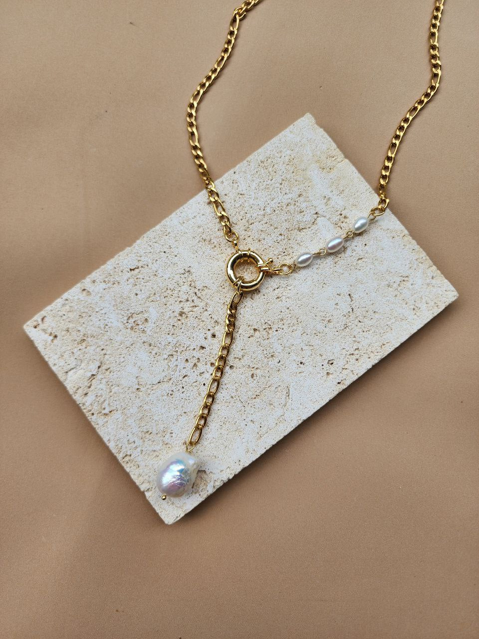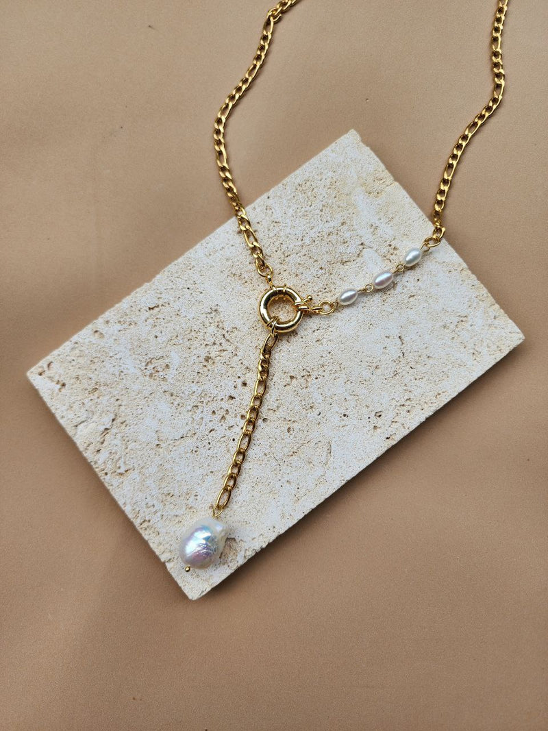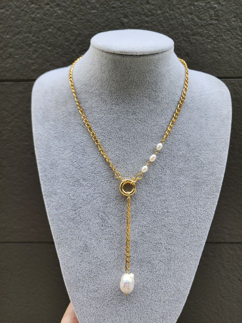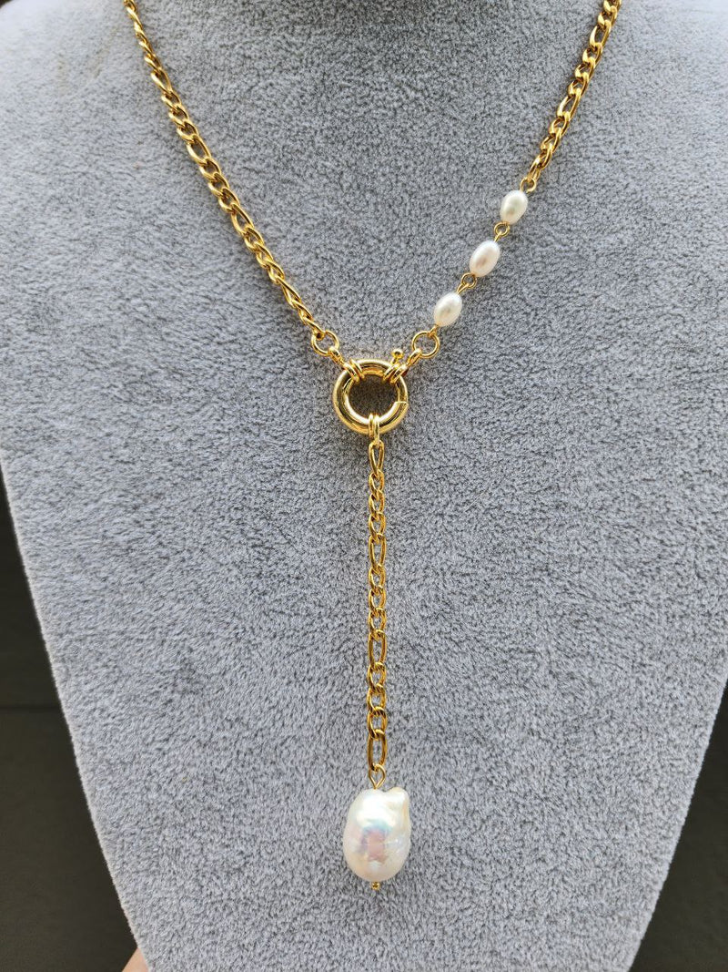 Add a modern twist to timeless elegance with this beautifully crafted necklace. Made from durable, gold-plated stainless steel, it features a unique asymmetrical design with delicate freshwater pearls and a striking drop pendant. Each pearl is naturally shaped, giving your piece a one-of-a-kind charm. Perfect for layering or wearing solo for a refined statement.